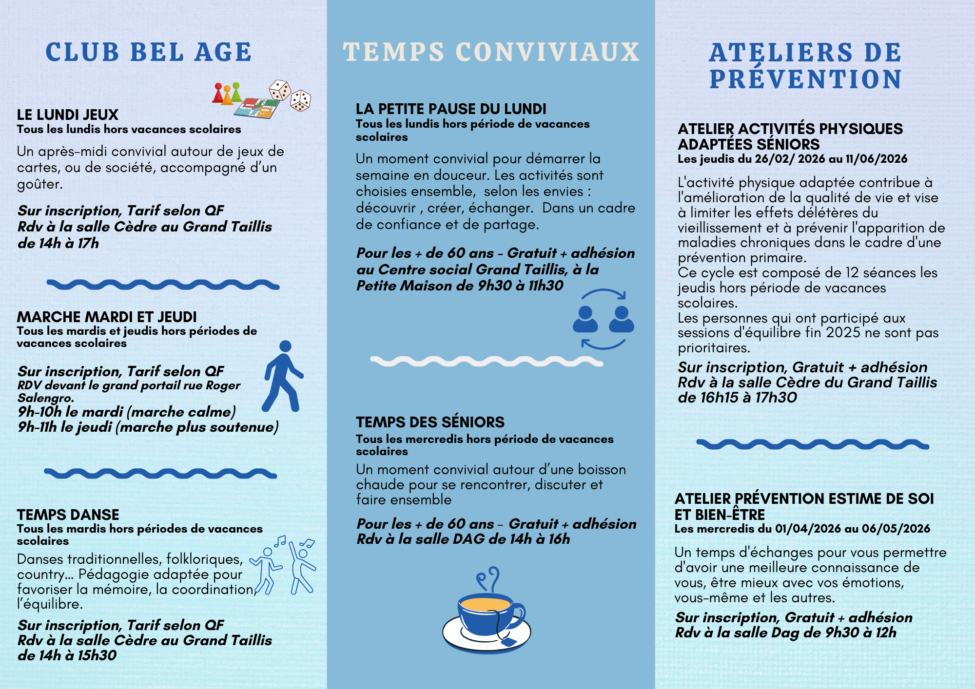 L’inscription au club permet de participer à 3 activités : jeux, marche et danse.