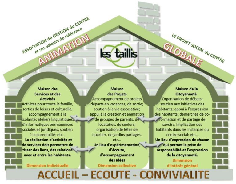 Le Centre social et socioculturel Les Taillis est ouvert à tous·tes dans le respect de chacun·e. Dignité humaine, solidarité et démocratie sont nos valeurs fondatrices. Le Centre social accueille tout le monde sans distinction d’âge, d’origine et de situation sociale. C’est une structure de proximité qui rayonne sur le territoire de Bron. Le Centre social met en œuvre des activités et des animations qui contribuent à améliorer la vie quotidienne et locale. C’est un lieu de rencontre, d’échanges intergénérationnels et interculturels.